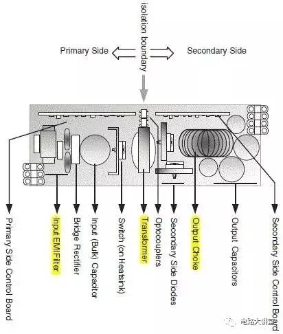 下图是典型的开关电源结构,黄色部分是磁性器件的应用。此外,辅助电源还需要反激变压器,PFC电路中有PFC电感,电源输出端口有时候基于EMC的要求也会增加EMC滤波电感。