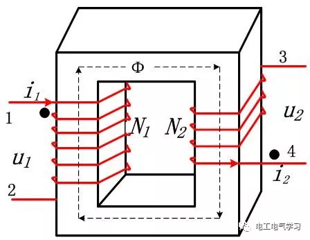 变压器是以高磁导率磁闭合磁芯为磁路的磁通传输器件,所以理论上变压器是全耦合器件,耦合系数是k=1,磁通是原边线圈产生的磁通(电生磁),由于变压器共用同一个磁芯,所以初次级的磁通量是相同的即φ1=φ12=φ(Ψ=N*φ称为磁链,φ12表示线圈N1对线圈N2产生的磁通,因为是空载,次级线圈2也就没有自身产生磁通的源头了),磁通量φ的变化率也是相同的,初级和次级的感应电动势如下表达式