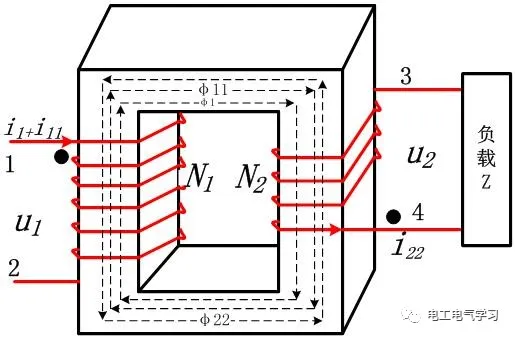 由负载引起的磁通φ22与初级线圈产生的磁通φ11方向是相反的,这是楞次定理告诉我们的,实质是副边线圈产生的磁通与原边除了激磁磁通要保持平衡。