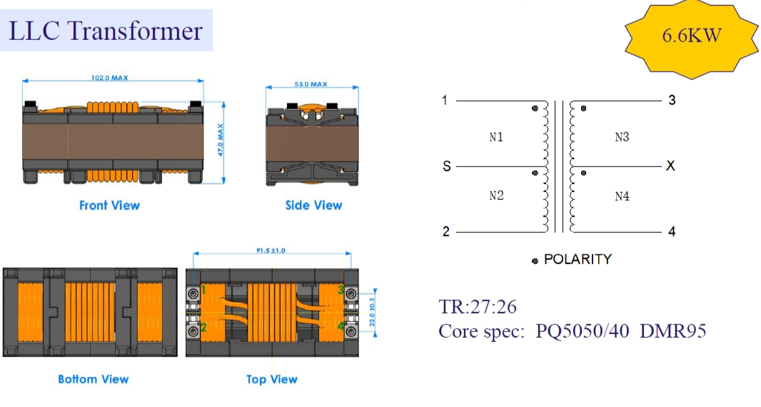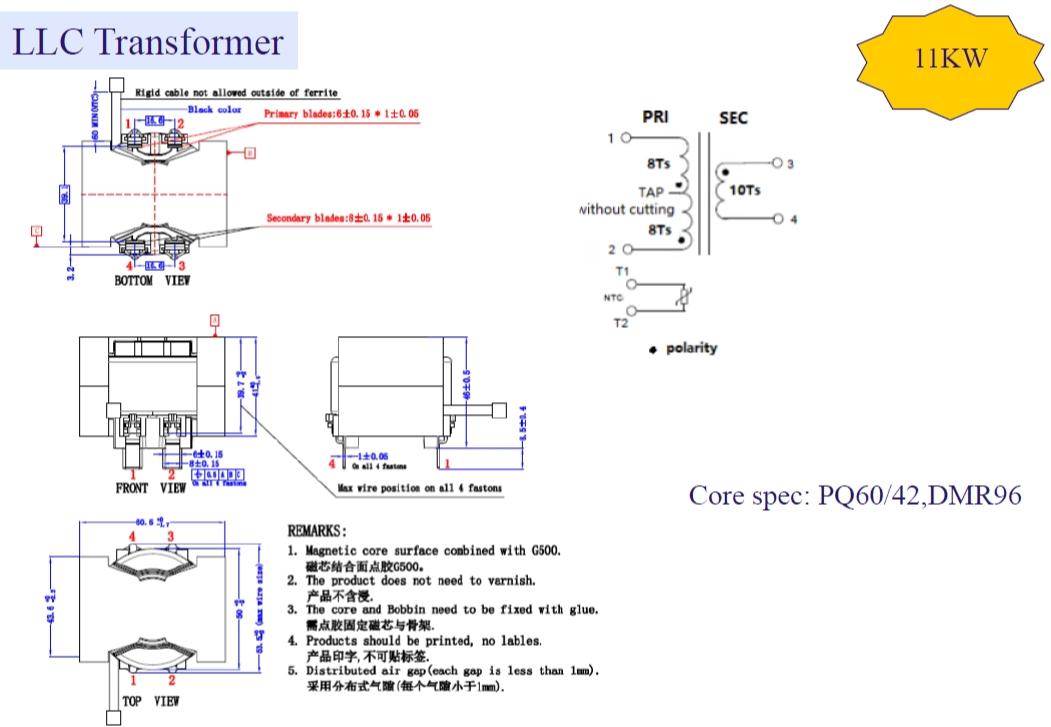 LLC谐振电路变压器是一种高效率、高功率密度、低EMI的变压器,一般是采用双槽骨架、初